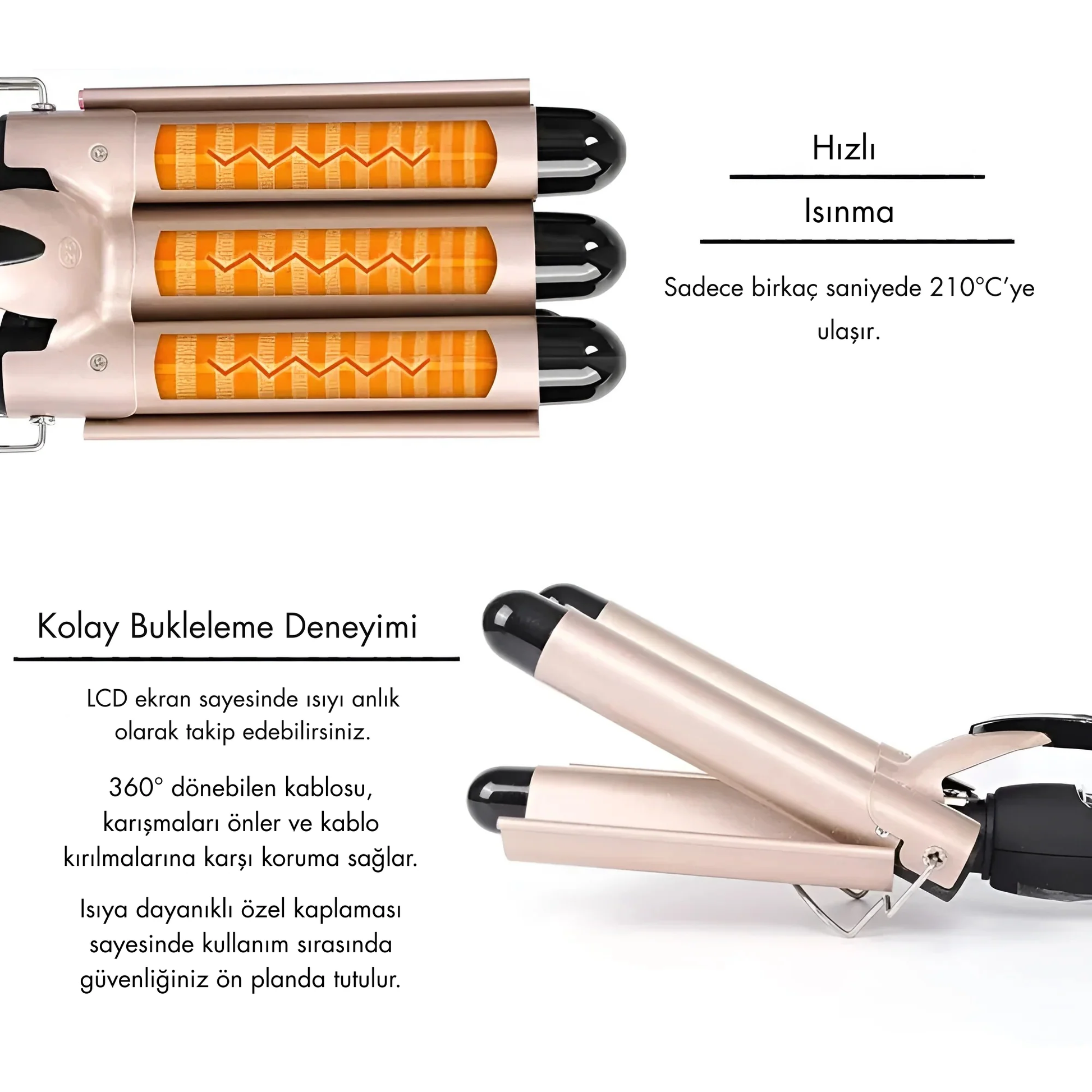 💎 3 Varil Tasarım – Tek seferde daha fazla saç tutarak hızlı ve eşit dalgalar oluşturur.